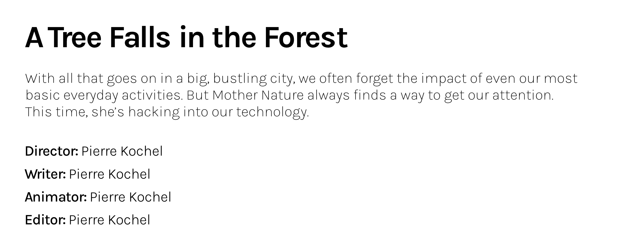 Text related to a project titled 'A Tree Falls in the Forest' by Pierre Kochel, covering roles like director, writer, animator, and editor.