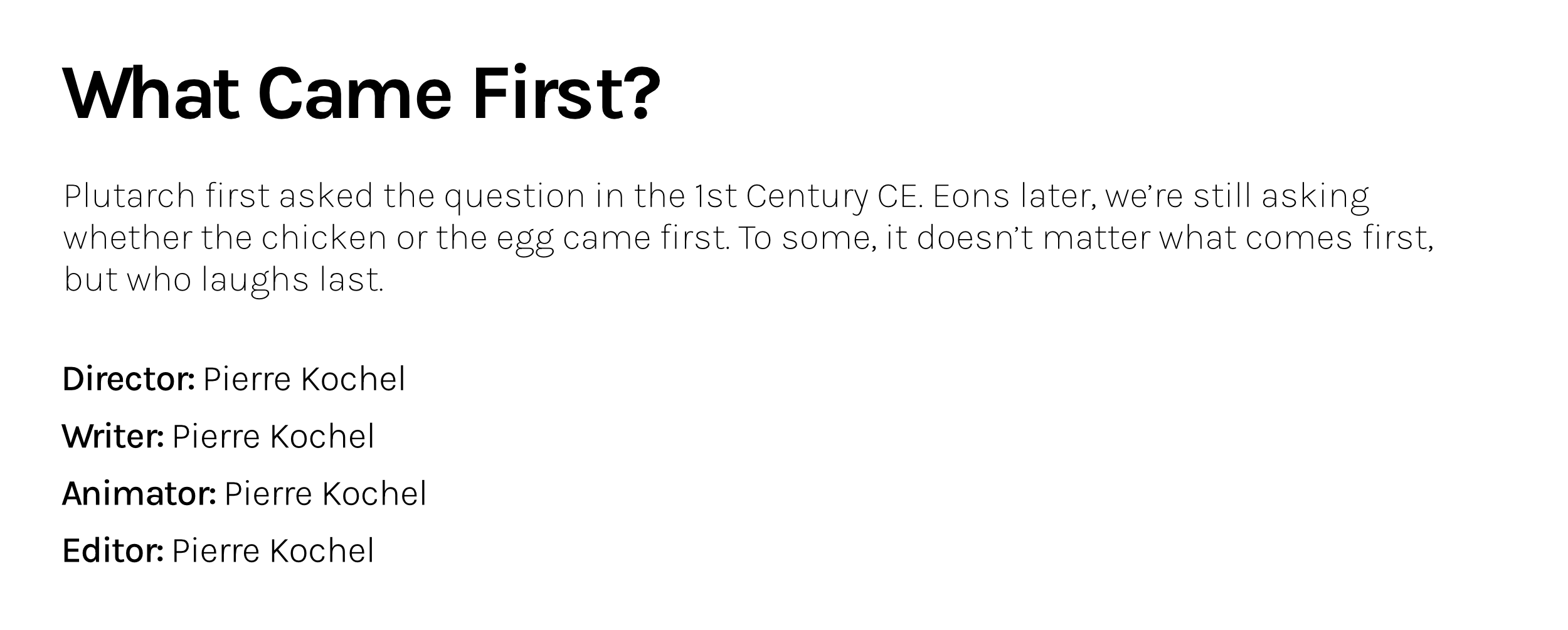 Text on a white background titled "What Came First?" discussing Plutarch's question about the chicken or egg, followed by the credits listing Pierre Kochel as Director, Writer, Animator, and Editor.