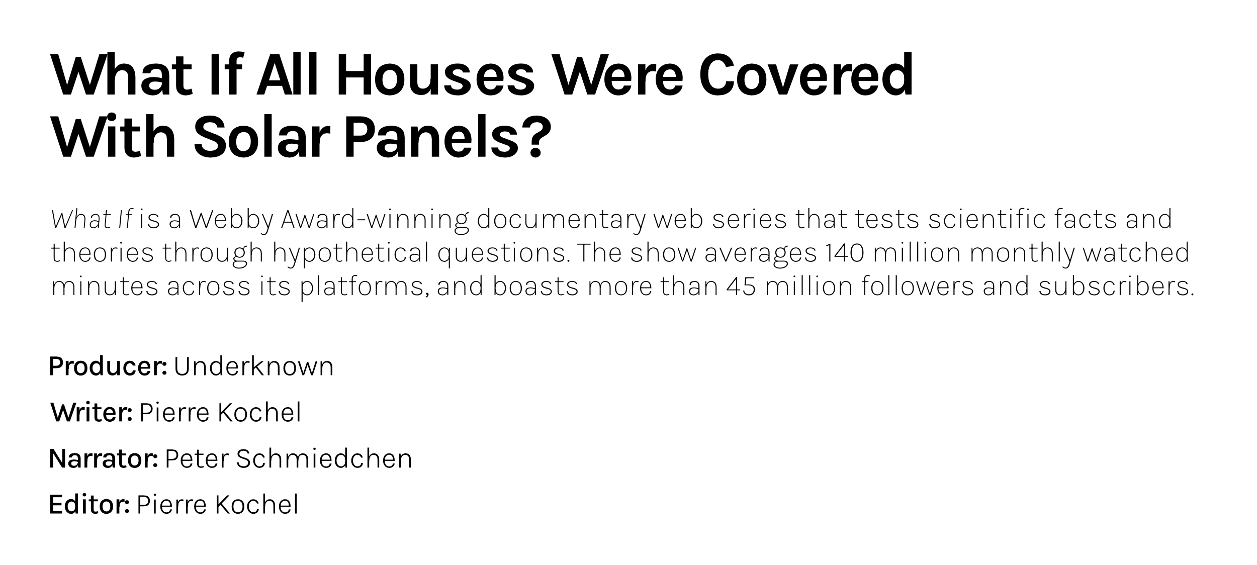 Title and credits of 'What If' web series episode about covering houses with solar panels, highlighting its popularity and production team.